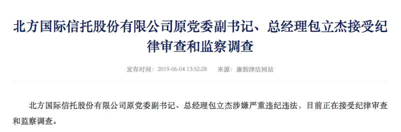 据天津市纪委监委6月4日发布的公告,北方国际信托股份有限公司(以下简称“北方信托”)原党委副书记、总经理包立杰涉嫌严重违纪违法,目前正在接受纪律审查和监察调查。