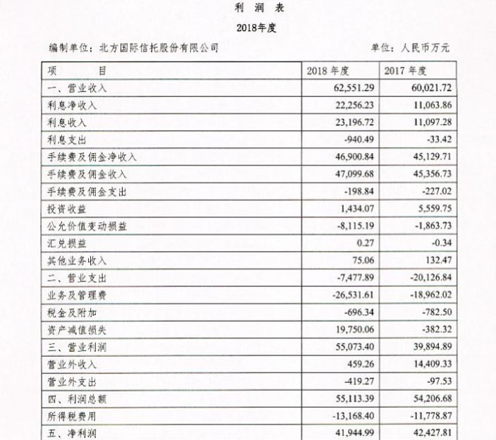 北方信托的业绩也在近年一度“掉队”。数据显示,北方信托营业收入在2016年大降17.6%后,2017年又下降了40.05%至6亿元,2018年小幅回升到6.25亿元;2016年利润总额下滑了33.73%至5.01亿元,2017年、2018年分别小幅回升到5.42亿元、5.51亿元,但与信托业协会发布的2018年数据相比,这一利润水平仅为同期行业均数10.76亿元的约一半。此外,北方信托近年还被卷入渤海钢铁债务危机。