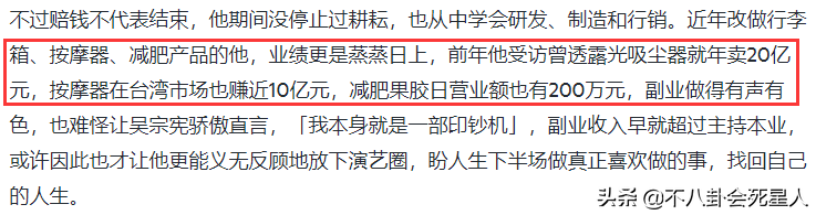 除了在台湾主持节目之外,其实吴宗宪这几年也在做行李箱,按摩器,减肥产品等副业生意。而且吴宗宪的副业发展得很好,更创下年赚30亿台币,折合7亿人民币的收入。