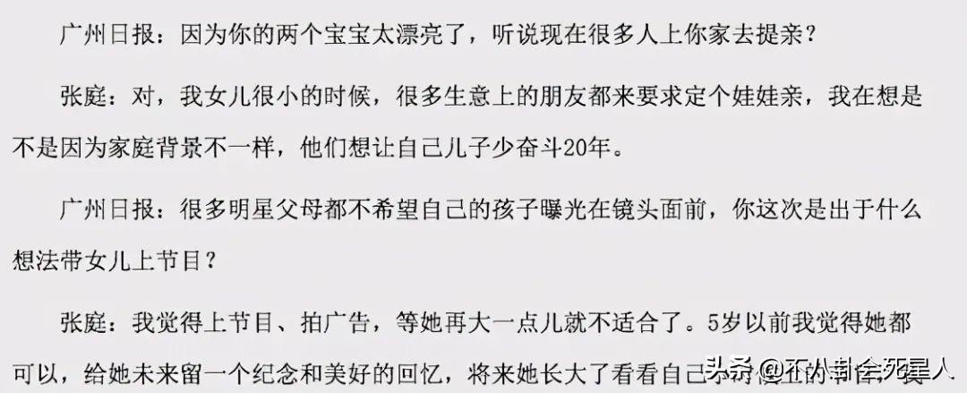 第四,张庭早前在节目中说过,自己家里保险箱全是钱。她还说她女儿小的时候,很多生意的朋友想跟他们家定娃娃亲,张庭觉得她的朋友是不是觉得家庭背景不一样,想让自家儿子娶自己的女儿可以少奋斗几年。