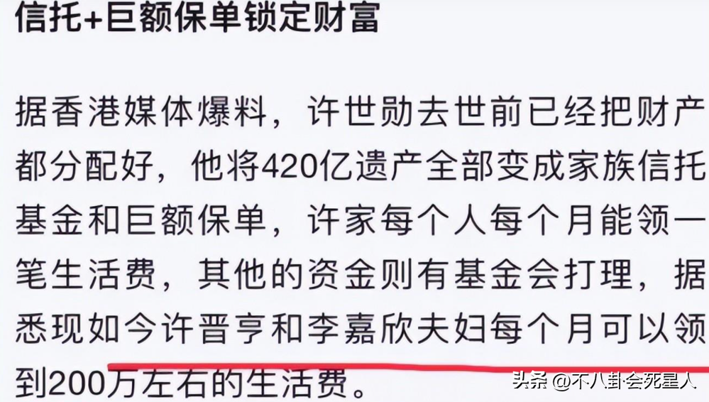许世勋把420亿成立了信托基金,规定家族中的13位受益人每个人每个月可以领取200万的生活费,也就是说李嘉欣“费尽心思”嫁入了百亿豪门,最后每个月只能拿到200万,她自己的身家都远远超过这个数目。