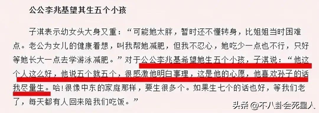 徐子淇一开始连生两个女儿,公公李兆基虽然送了千万豪宅和百万珠宝,但在徐子淇第三胎的时候,李兆基就直接对外说,如果徐子淇第三胎生的还是女儿,他会觉得很失望。