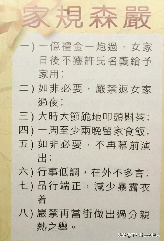 传闻当年李嘉欣嫁入许家,她的婆婆就立下了8条家规,其中包括1亿礼金一次过,不能回娘家过夜,不能出去工作,不能穿着太暴露等等。