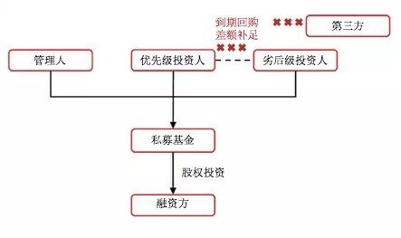 第二种模式依旧存在优先级投资人和劣后级投资人,优先级投资人依旧享受固定期限下固定收益,该收益可以有两种方式兑付,一种是私募基金通过寻找第三方流动性支持,定期给予优先级投资人固定收益;另一种是把劣后级投资人的钱定期垫付给优先级投资人固定收益。