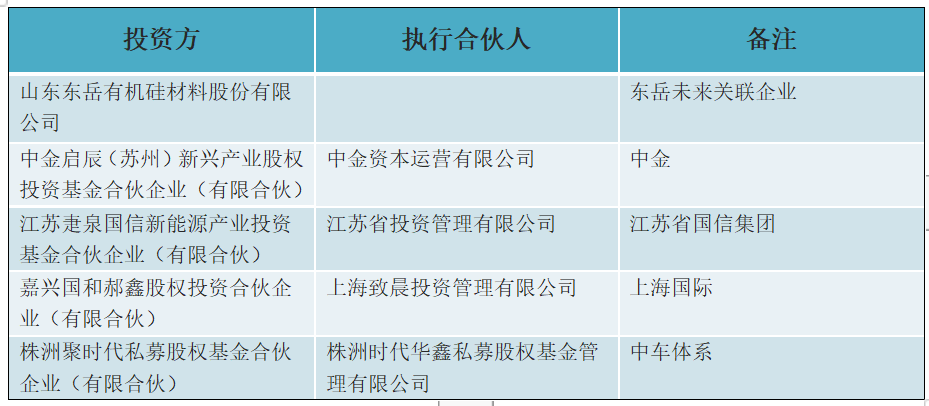5月28日,东岳硅材(300821.SZ)发布公告称,关联方山东东岳未来氢能材料有限公司(以下简称“东岳未来氢能”)完成分拆后的一轮融资,分别由山东东岳有机硅材料股份有限公司、中金启辰(苏州)新兴产业股权投资基金合伙企业(有限合伙)、江苏疌泉国信新能源产业投资基金合伙企业(有限合伙)、嘉兴国和郝鑫股权投资合伙企业(有限合伙)、株洲聚时代私募股权基金合伙企业(有限合伙)等5家投资者,按照投前15亿的估值对其进行增资。