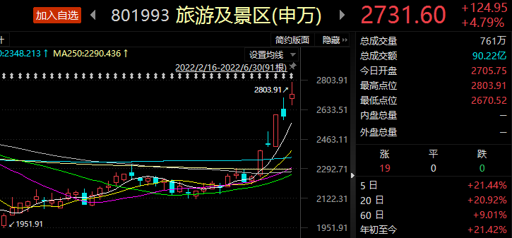 申万旅游及景区(801993)指数今天大涨4.79%,19只成分股全线飘红,近5个交易日累计涨幅达21%。