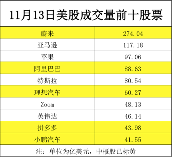 周五,美股成交量排名前十名的中概股中,半数都是中概股,分别是新能源车企业蔚来、理想、小鹏,以及电商公司阿里、拼多多。