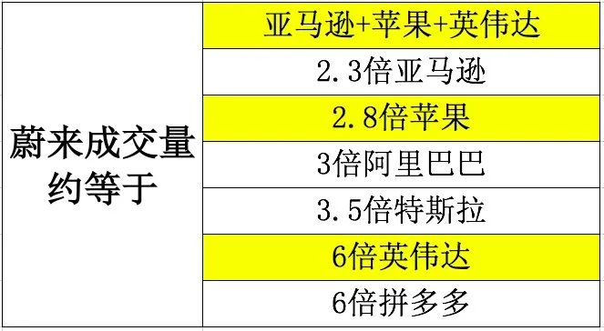 蔚来汽车的成交金额,竟然比苹果+亚马逊,高出约60亿美元,对应人民币400亿。