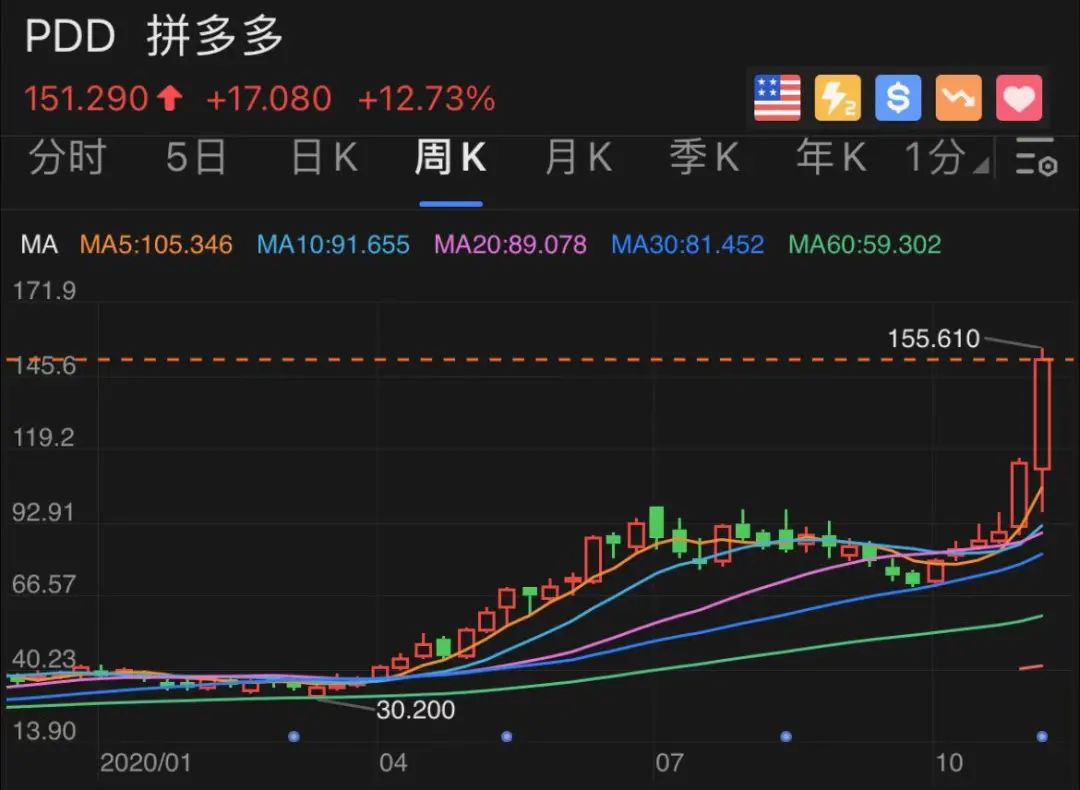 拼多多今年涨超300%,在11月,拼多多的涨幅达68%。