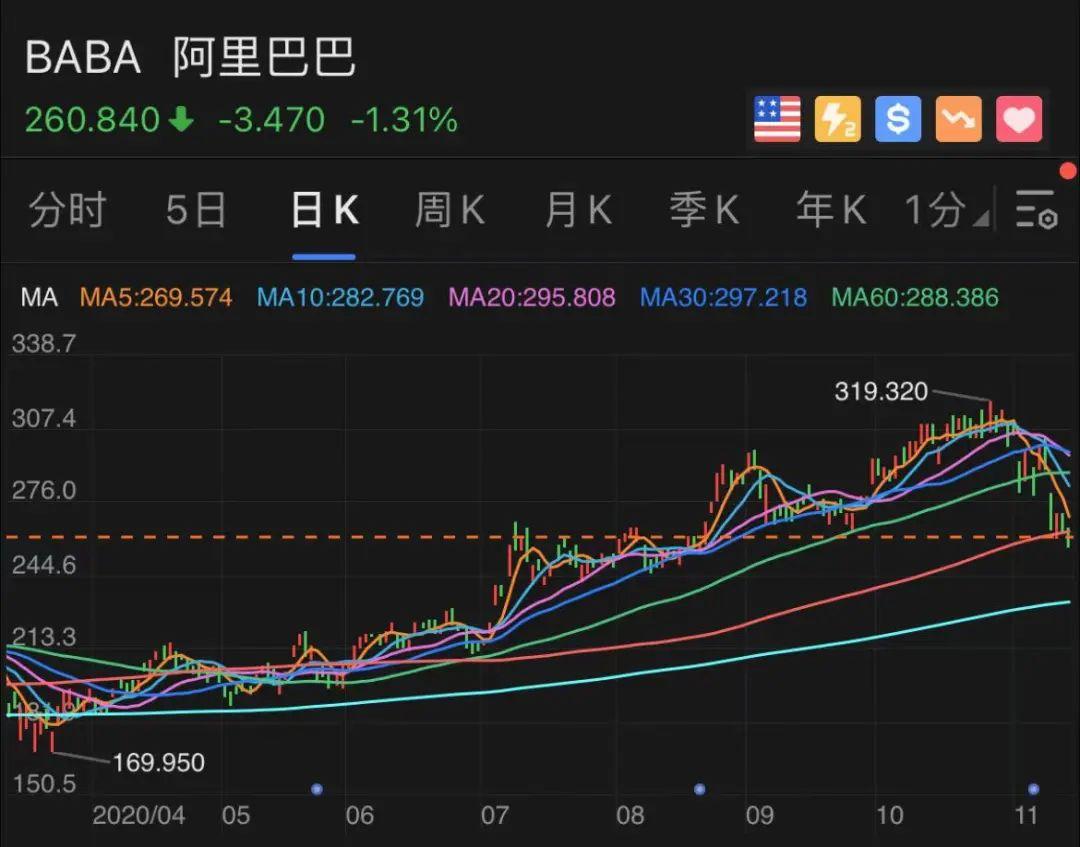 今年10月,阿里巴巴不断创下新高,股价曾飙升至319美金。即使近期因蚂蚁暂停上市和反垄断新规大幅回调,阿里巴巴今年依旧涨超22%。