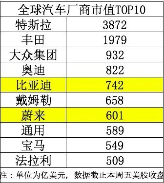 截至本周五美股收盘,汽车厂商市值排名前十中,中国车企已有两家。其中,蔚来汽车以601亿美金的市值力压通用、宝马和法拉利,排名第七。