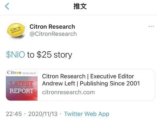 做空机构香橼研究公司(Citron Research)在Twitter上发布消息称,称蔚来汽车(NIO.N)目标价应为25美元,仅为当时股价53美元的一半。