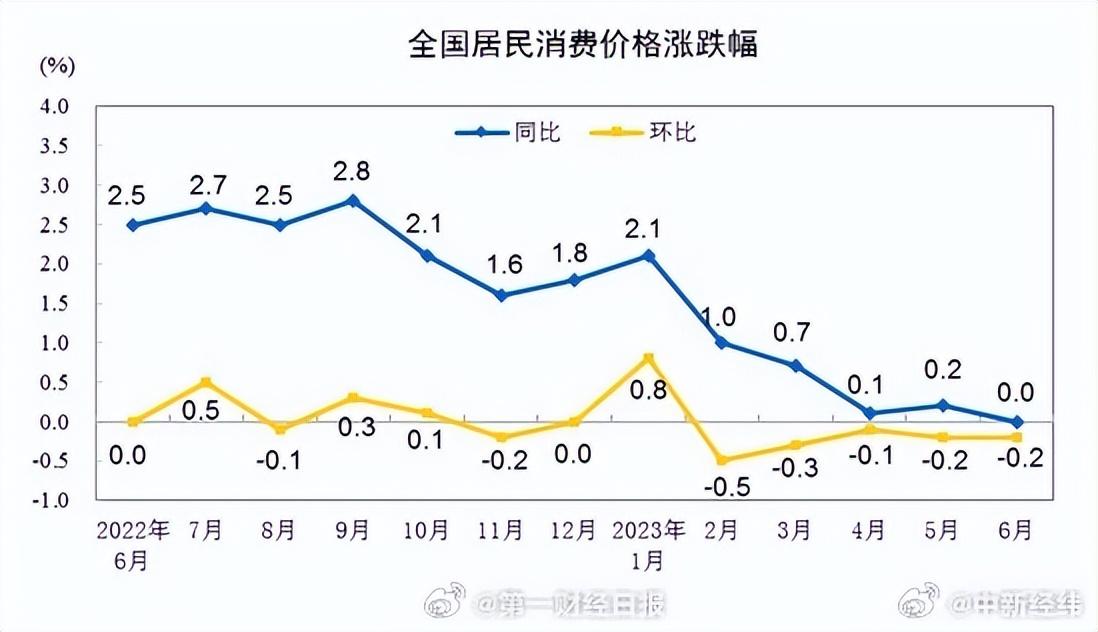 据国家统计局,2023年6月份,全国居民消费价格同比持平。其中,城市持平,农村下降0.1%;食品价格上涨2.3%,非食品价格下降0.6%;消费品价格下降0.5%,服务价格上涨0.7%。1—6月平均,全国居民消费价格比上年同期上涨0.7%。