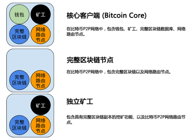 一个包含四个完整功能的比特币网络节点:钱包、矿工、完整区块链、网络路由节点