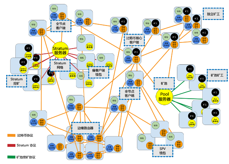 简单理解:主网络节点通过运行P2P协议相互连接,主网络节点主要是核心客户端、全节点客户端和轻量钱包等节点,另外矿池服务器和Stratum服务器通过P2P协议桥接连入主网络,然后挖矿节点通过矿池挖矿协议接入矿池服务器,Stratum挖矿节点和轻量Stratum钱包节点通过Stratum协议接入Stratum服务器,从而构成了一个完整的比特币网络,也叫扩展比特币网络。