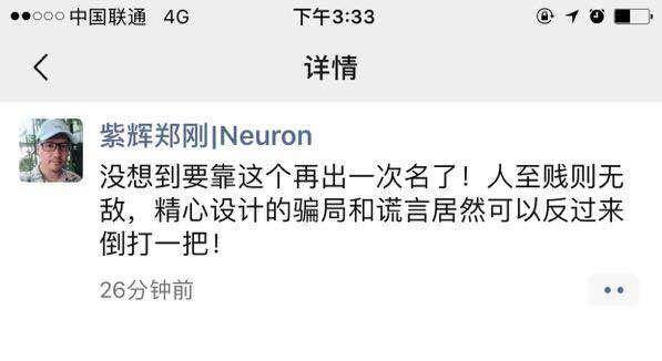 不过,郑刚今天下午在朋友圈回应称,“没有想到靠这个再出一次名了!人至贱则无敌,精心设计的骗局和谎言居然可以反过来倒打一耙。”疑似指责妻子周美毅。