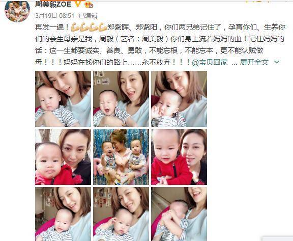 市界发现,周美毅曾在3月19日发过一条微博,“郑紫晖、郑紫阳,你们两兄弟记住了,孕育你们、生养你们的亲生母亲是我,周毅(艺名:周美毅)你们身上流着妈妈的血!记住妈妈的话:这一生都要诚实、善良、勇敢,不能忘根,不能忘本,更不能认贼做母!!!妈妈在找你们的路上……永不放弃!!!”
