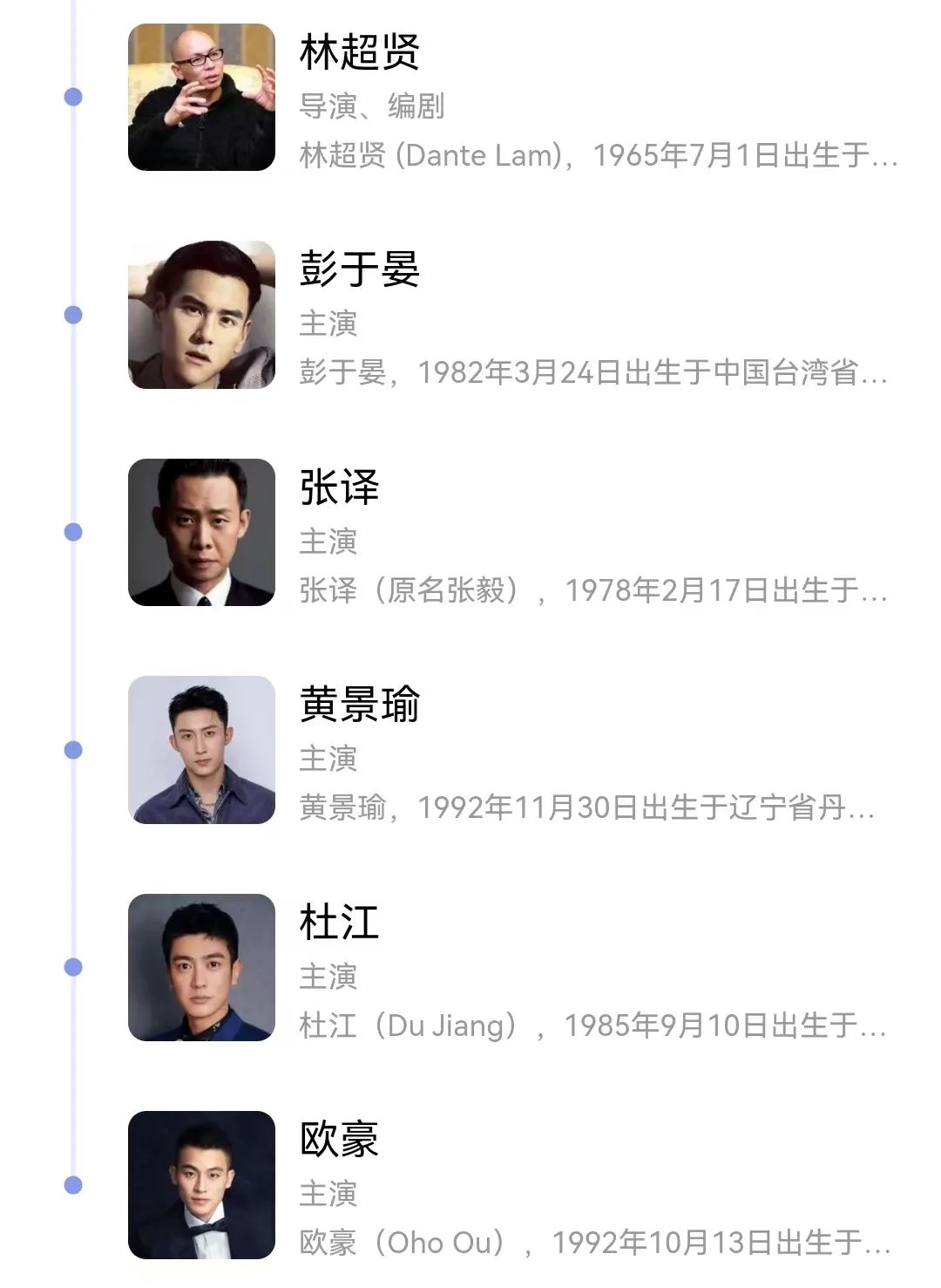 演员表内有彭于晏、张译、黄景瑜、欧豪、杜江。