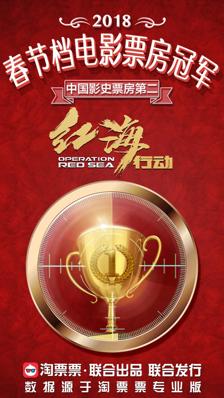 根据淘票票专业版数据显示,截至2018年3月14日下午17点30分,《红海行动》内地总票房达到33.93亿元,正式超越2016年周星驰导演的《美人鱼》(33.93亿元),成为新的内地影史票房亚军。