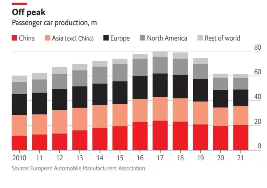 中国需求放缓的同时,加之芯片短缺问题——芯片在现代汽车上随处可见,到2022年,全球汽车产量已降至6200万辆左右。