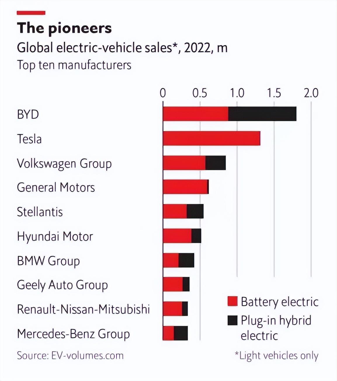 按照纯电汽车销量排名,中国比亚迪位列第二,按照新能源汽车销量排名,比亚迪则遥遥领先。在老牌汽车制造商中,大众汽车集团是最亮眼的电气化推动者,但它仅排在第三位,电动汽车销量为57万辆,占其总销量的7%。
