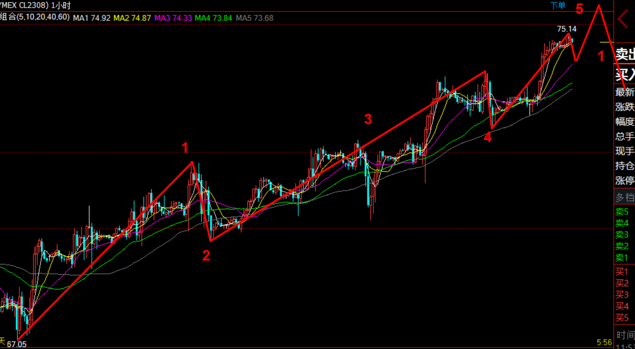 刚刚细细一看,我们前面也就是周一的数浪可能存在错误把2浪数错了,也就导致我们后面的3-5浪也数错了,所以我们重新整理一下,目前的行情就处于5浪,那么1小时周期的1浪是从67.05美元到71.77美元,上涨幅度为4.72美元,2浪从71.77美元到69.68美元,回调幅度为2.09美元,3浪从69.68美元到74.15美元,上涨幅度为5.46美元,4浪从74.15美元到72.65美元,回调幅度为1.5美元,而5浪目前从72.65美元到75.14美元的上涨幅度只有2.49美元,和1浪的幅度还差了2.23美元,也就是说5浪如果和1浪的幅度差不多的话,终点大概在77.37美元,如果小于1浪的话,那么5浪的终点就在77美元下方。