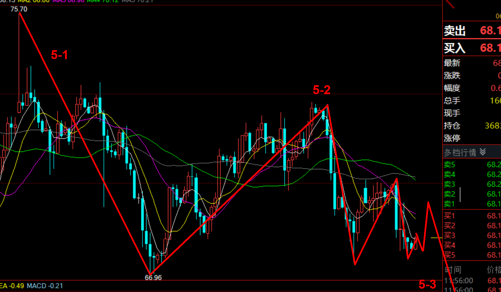 昨日原油的走势基本上是按照我们的预判和画图来走的,也就是先小幅上涨再下跌,然后再小幅上涨,最后再下跌,目前的上涨就是,图中所示的是5-3浪,目前5-3浪的下跌幅度还没有5-1浪的下跌幅度大,所以如果今日的行情继续下跌的话,那么要先破了前期的低点67.35美元再破66.96美元,最后到63.70美元才能下跌幅度大于5-1浪的下跌幅度,如果行情真是这样下跌的话,那么5-5浪就会跌破60美元,当然真那样下跌的话那也是一个比较长的周期,不会那么快,因为行情在75.70美元和66.96美元这个区间都已经震荡了一个多月了,今日早晨的API数据是利多,行情没有太大的响应,所以老李预判下午的行情应该也是先小幅回调之后再上,最后才开始下跌。如下: