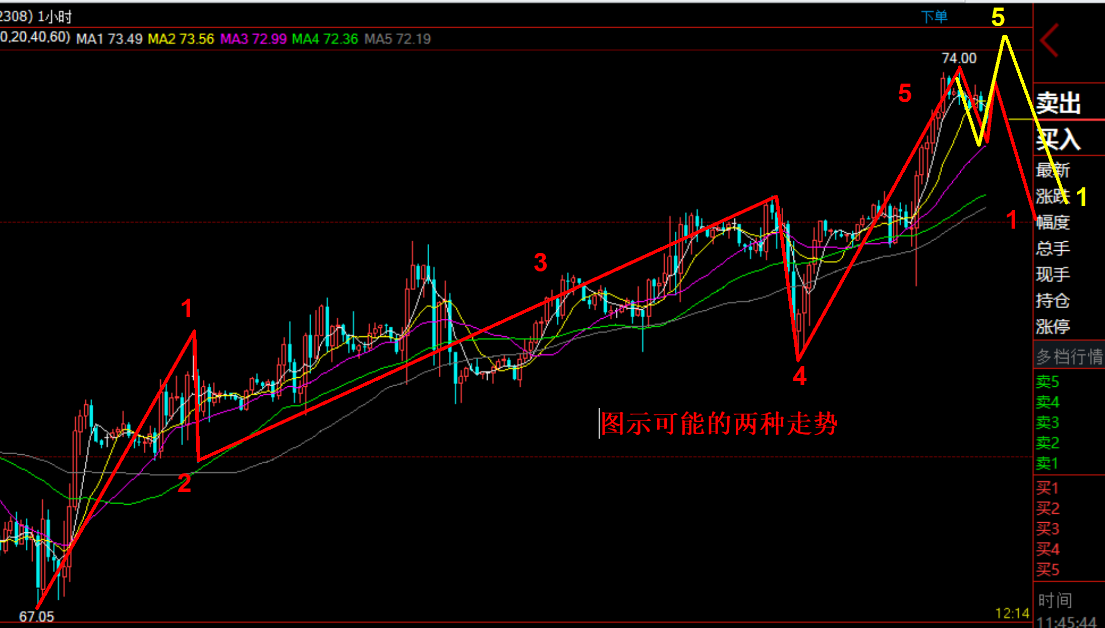 67.05美元作为1浪的起点的话,那么目前的上涨我们可以看作是1小时的主升5浪,1浪从67.05美元到70.61美元左右,上涨幅度为3.56美元,2浪从70.61美元到68.93美元左右,回调幅度为1.68美元,3浪从68.93美元到72.34美元,上涨幅度为3.41美元,4浪从72.34美元到70.21美元,回调幅度为2.13美元,如果今日的高点74美元是5浪的终点的话,那么目前5浪的上涨幅度为3.79美元,目前5浪的上涨幅度已经大于3浪了,5浪变成最长的一浪了,如果74美元是5浪的终点的话,那么今日的行情就会由目前的行情继续下跌,或者下跌之后再反弹但是破不了74美元,最后再下跌,所以今日的操作如下;