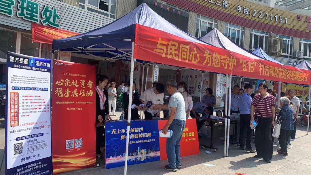5月15日,方正证券丽水丽青路证券营业部联合丽水市公安局莲都分局走进丽水莲都银苑社区,开展“与民同心 为您守护 ‘5.15’打击和防范金融犯罪宣传日”为主题的投资者宣传活动。本次活动通过案例分享、现场答疑、互动游戏等形式,提高社区居民防范金融诈骗及电信诈骗意识,切实做好个人金融信息保护,严管好个人的“钱袋子”。活动期间,营业部投教小队成员在负责人带领下积极向居民讲解《股东来了》知识竞赛活动意义,全过程指导居民注册答题。