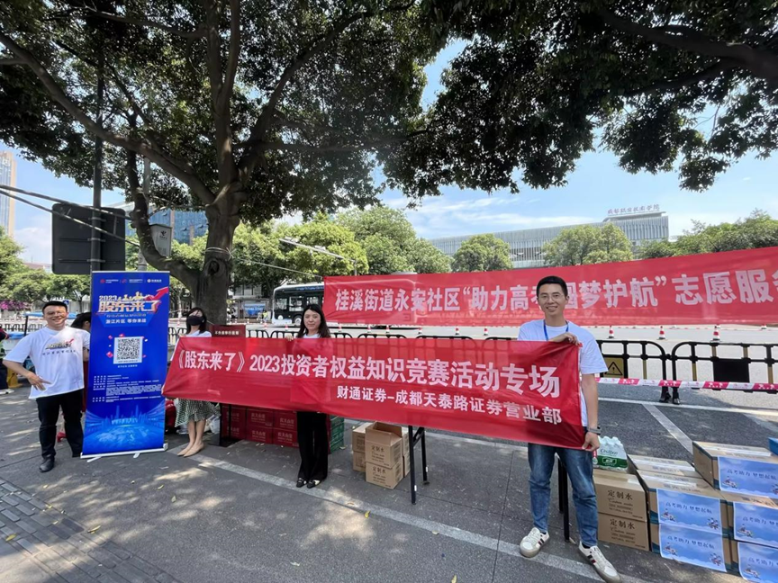 6月7日,财通证券成都天泰路营业部携手成都桂溪街道永安社区在成都职业学院的高考考场附近,联合开展了以《股东来了》和《助力高考圆梦护航》的公益活动,为高考学子加油助威。工作人员在现场准备了爱心加油站,为莘莘学子及家长提供了夏日清凉补给,向考生传达勇气、信心和真诚的祝福,向门外焦急等待的家长们纷纷发放了《股东来了》宣传扇,并介绍了本次《股东来了》公益活动意义,目的是提升投资者的风险防范意识,掌握更多的投资者权益保护知识。