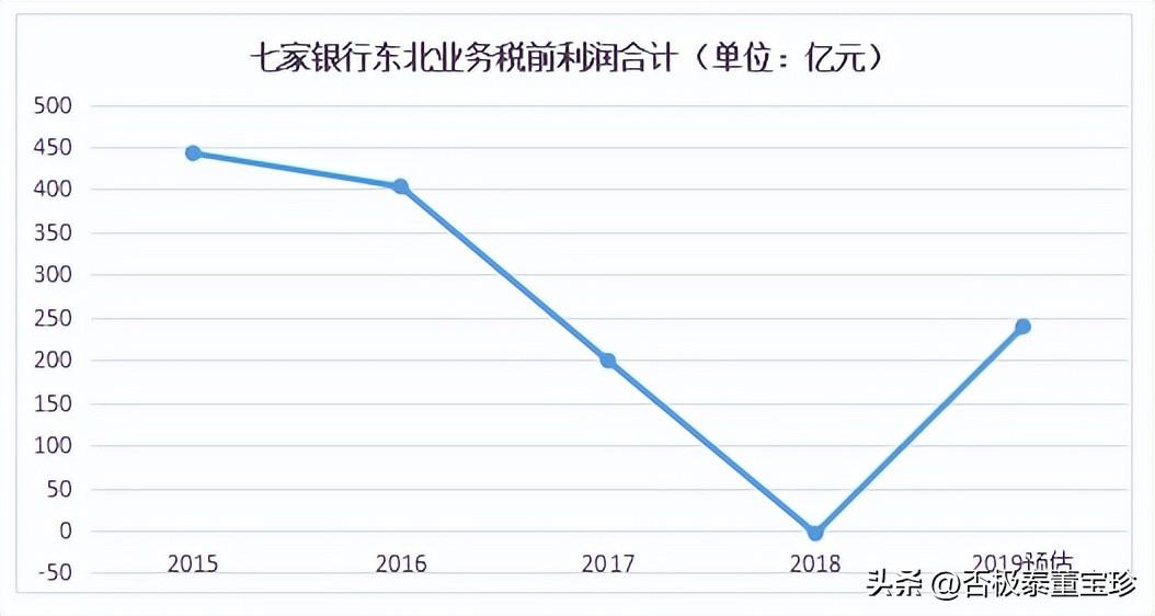 七家合计净利润最高时,正常年份可以获得400亿左右的净利润,但是从17、18两年就开始大幅衰退,到18年七家银行合计的净利润是亏损3亿,可是到了2019年,七家银行合计净利润强劲回升到了263亿。这意味着大型银行在东北地区的经营已经摆脱了资产质量恶化带来的减值损失的打击,出清了不良资产,利润开始回升到正常状态。