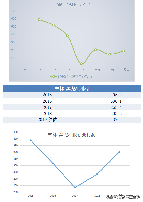 以下是从东三省银监局网站获取的东三省银行业净利润数据,图表中18年之前的数据均来自于相应省份银监局网站,2019年是东三省各省银监局只公布了一季度的净利润数据,所以我把一季度的净利润数据乘以4推算得到其全年数据: