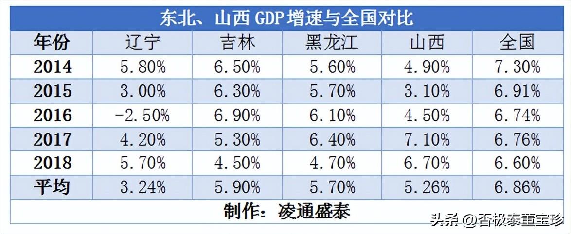 辽宁省从2014年到2018年的5年中,GDP的算术平均增速只有百分之三点多。而吉林、黑龙江的平均增数也没有达到6%。与此同时,中国全国的GDP增速接近7%。