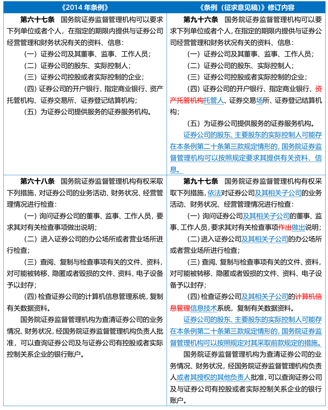 如上表所示,与《2014年条例》相比,《条例(征求意见稿)》第九十六条第二款和第九十七条第二款针对《条例(征求意见稿)》第二十条第三款规定的底线要求相应补充完善了监管核查手段,并扩展了《2014年条例》项下监管核查手段的适用对象。具体而言,在证券公司股东、主要股东的实际控制人可能存在违反相关底线要求的情形下,中国证监会可以按照规定要求其提供有关资料、信息,并采取上表所示的适用于证券公司的监管核查手段对其采取措施。