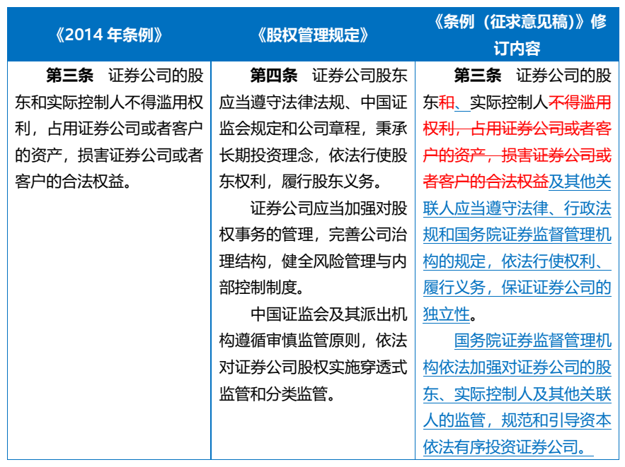 相较于《股权管理规定》,《条例(征求意见稿)》增加了相关适用主体“不得损害公司资产完整、人员独立、财务独立、机构独立和业务独立”的底线要求,且我们理解该等底线要求系对《条例(征求意见稿)》第三条新增加的“保证证券公司的独立性”的基本原则和第二十条第一款新增加的“证券公司应当依法独立经营”的原则性要求的具体细化。但该等修订是否可被解释为仅当相关适用主体违反规定干预公司的经营管理活动,且导致损害公司资产完整和独立性的损害结果时才构成违反上述底线要求,可能有待进一步明确。
