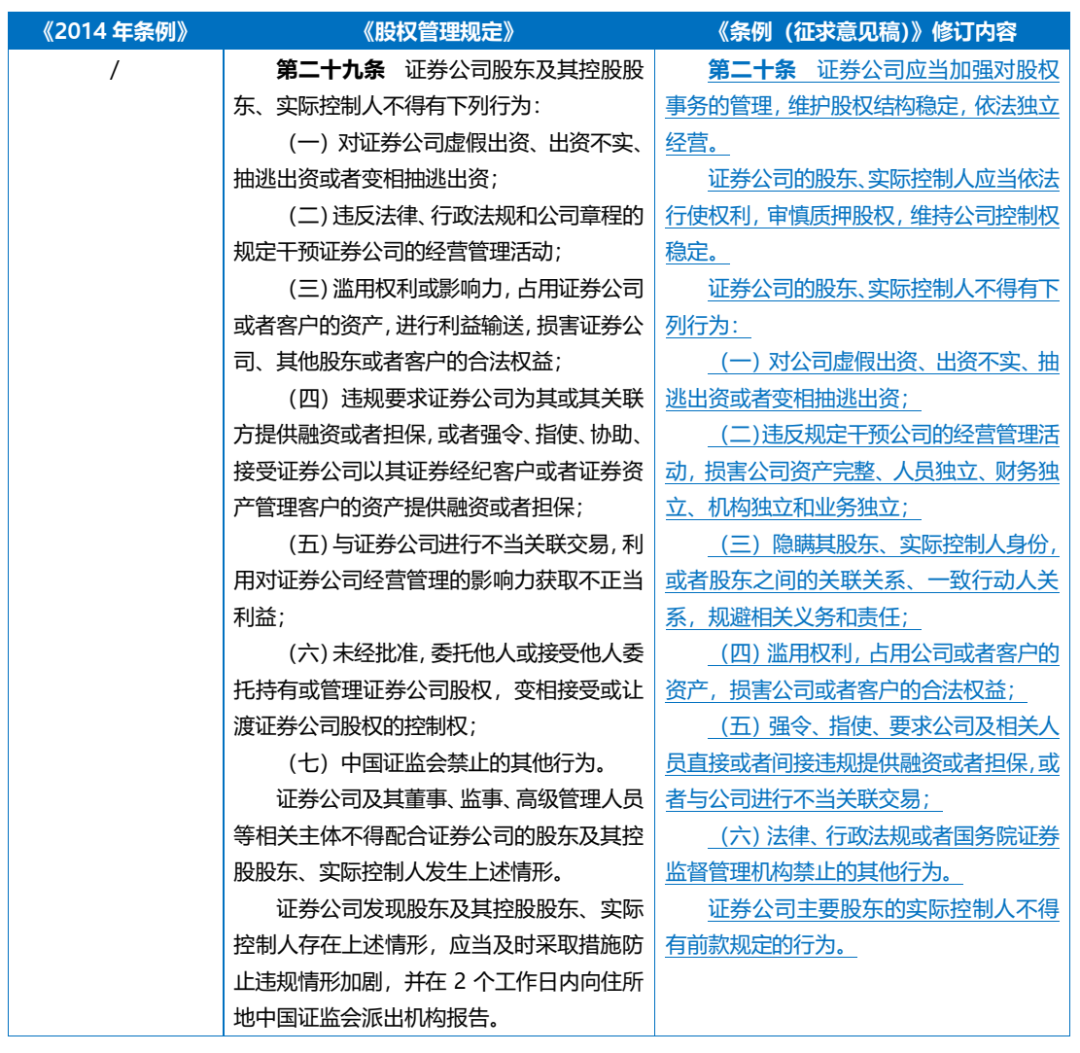 相较于《股权管理规定》,《条例(征求意见稿)》在第二十条中完整新增了此项底线要求。而《股权管理规定》第二十二条已从正面规定了“证券公司股东应当真实、准确、完整地说明股权结构直至实际控制人、最终权益持有人,以及与其他股东的关联关系或者一致行动人关系”,并从反面要求证券公司股东“不得通过隐瞒、欺骗等方式规避证券公司股东资格审批或者监管”,而《条例(征求意见稿)》则将前述具体的禁止性要求调整为更宽泛的“不得规避相关义务和责任”,呼应了更加复杂的监管实践。