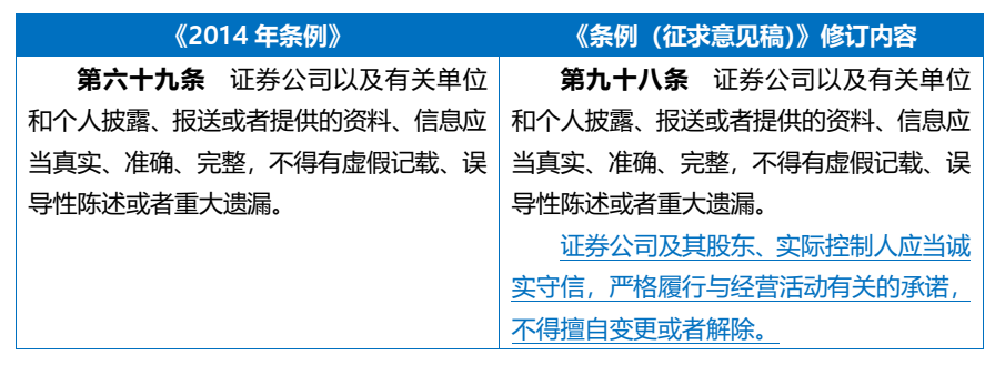 如上表所示,《条例(征求意见稿)》第九十八条增加了“证券公司及其股东、实际控制人应当诚实守信,严格履行与经营活动有关的承诺,不得擅自变更或者解除”的规定。违反前述规定的,将根据《条例(征求意见稿)》第一百一十九条被“责令改正,给予警告,并处以100万元以下的罚款;情节严重的,并处撤销相关业务许可;直接负责的主管人员和其他直接责任人员将被给予警告,并处以50万元以下的罚款”。